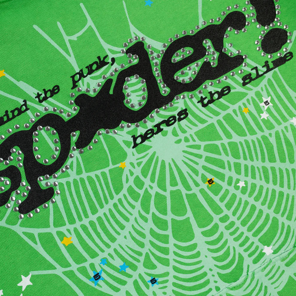 Sp5der Punk V2 Rhinestone Hoodie Bright Green